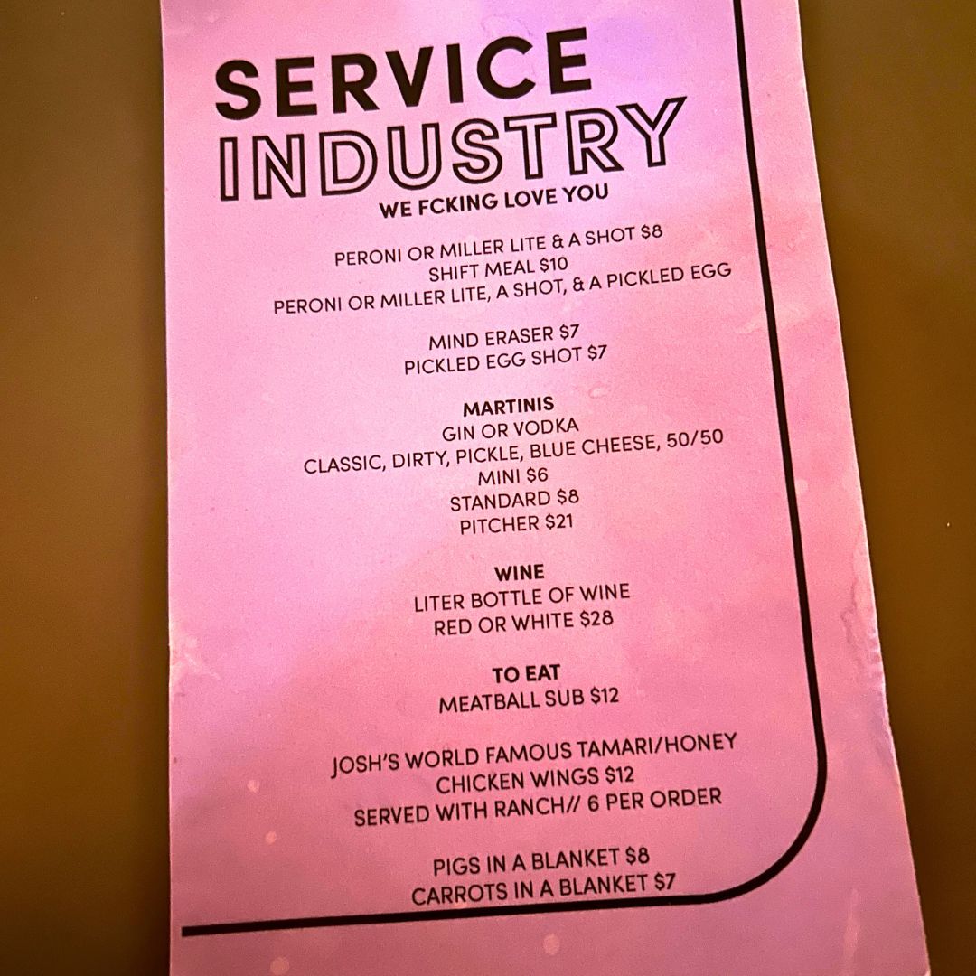 Replacing the former Bar. Food location, this spot became the hottest thing on a Sunday night after expressing their love for the service industry in their little menu.