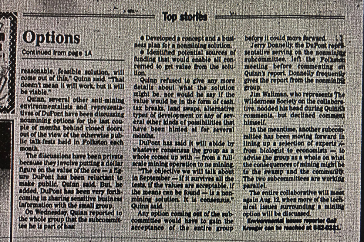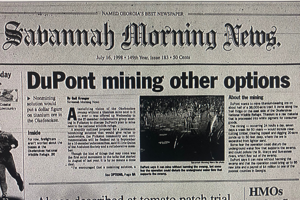 July 16, 2023 – The front page of the Savannah Morning News 25 years ago today was about an effort to prevent a company from mining titanium next to the Okefenokee wildlife refuge. After facing opposition to the plan, Dupont and environmentalists had developed a potential “non-mining solution” that would likely involve compensating the company for the titanium’s estimated value, according to the article.