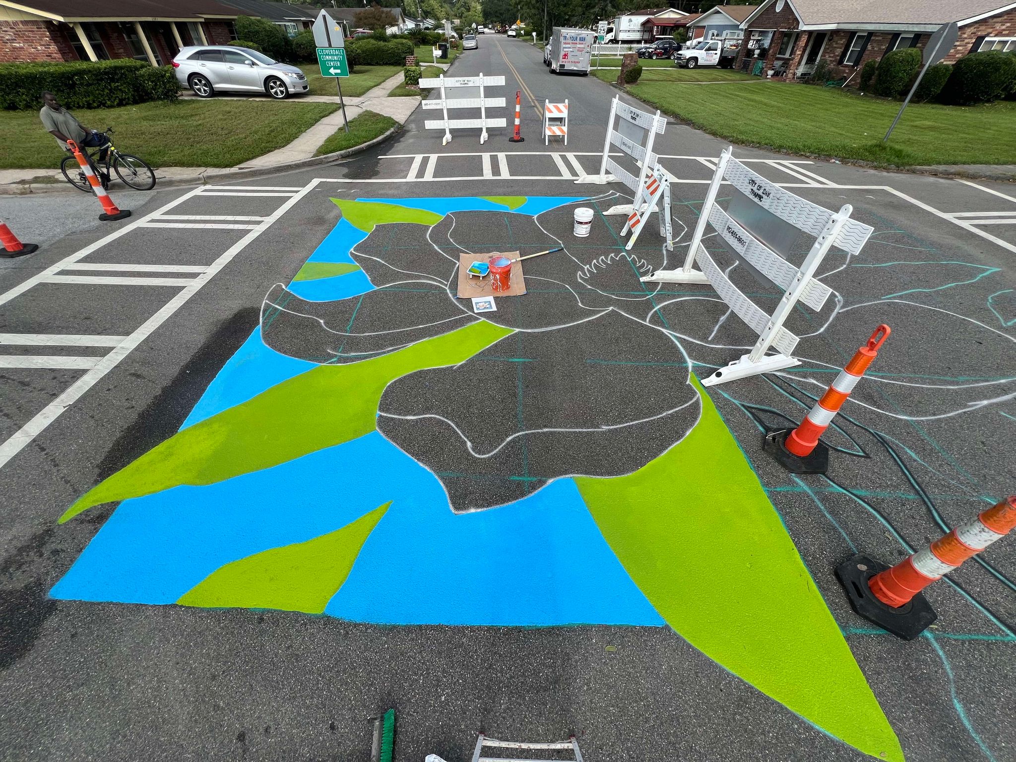 MacGregor has been documenting the progress of the project on social media after meeting with the community beforehand to explain the process, respond to questions and receive input. His photos document the process from the beginning stages showing a grid and outline of the drawing on the street with barricades surrounding it, with one lane of traffic closed off as he works in sections, and ultimately closing off the other lane as he moves to the mural’s other half.