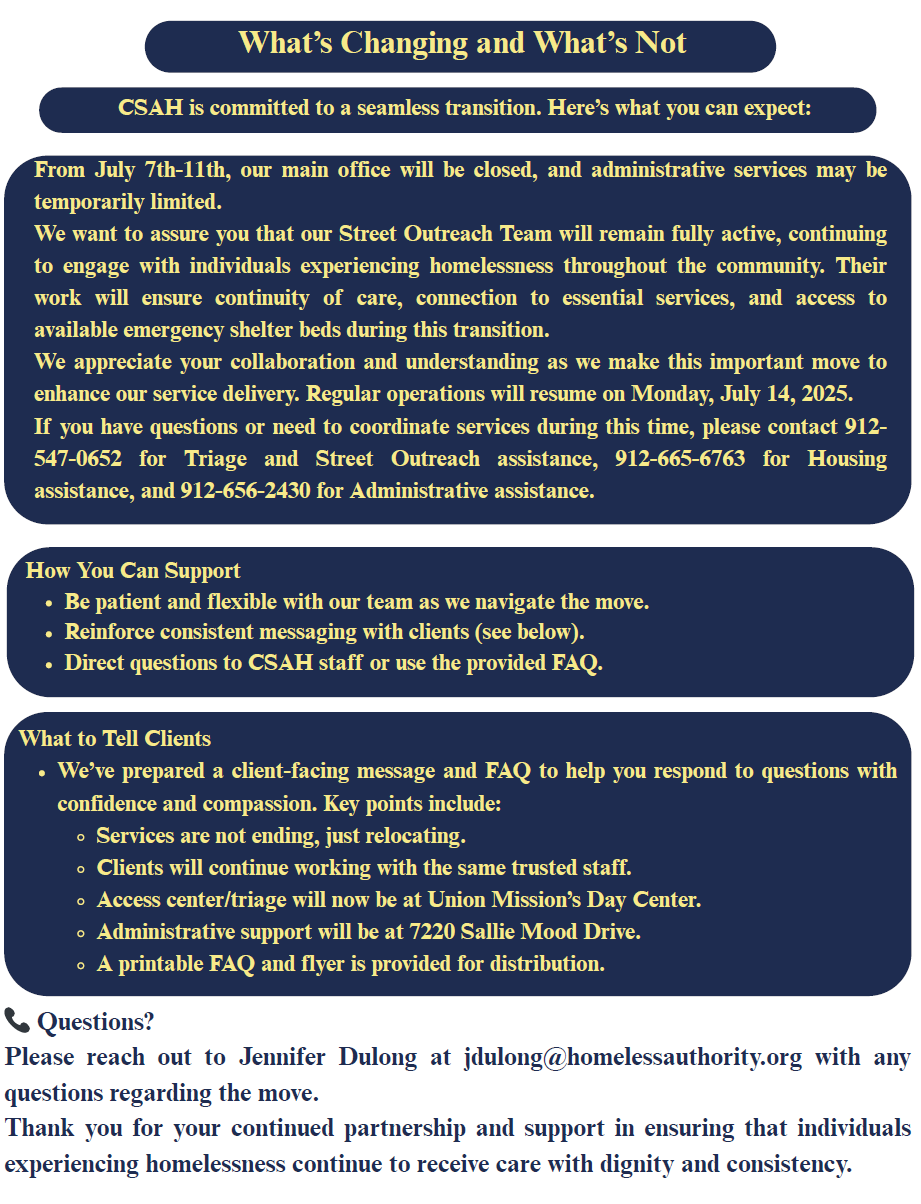 The Chatham Savannah Authority for the Homeless is moving its triage/access center staff to Union Mission’s Grace House Day Center and co-locating their administrative team members and deploying outreach services from Goodwill Southeast Georgia’s Sallie Mood location.